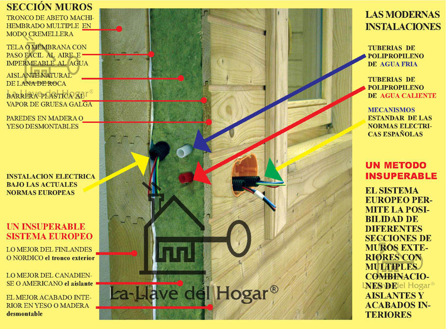 El sistema «EUROPEO» (cuyo nombre y sistema fue ideado en nuestro país por la llave del hogar® en 1.999) se mezcla las mejores partes de los sistemas constructivos Canadiense ó Americano que esta basado en mucho aislantes y lo mejor del sistema Nórdico ó Finlandés basado solo en el tronco de madera con estructuras semi-pesadas. Además se incorporan tabiques internos (no estructurales) en lugar de paredes de carga inamovibles.