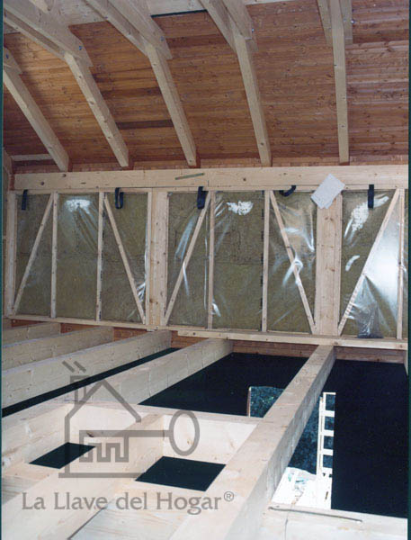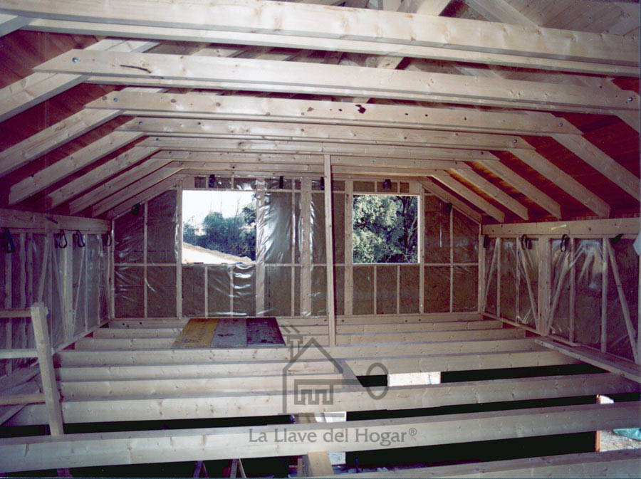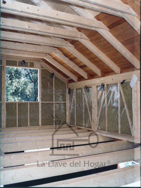 Los troncos rectos se ensamblan entre sí por el sistema de doble machihembrado, que confiere gran robustez a la vivienda. Al igual que en el suelo, en las paredes, tabiques y techos interiores se introducen diversos aislantes y/o barreras de humedad, así como rastréeles, que son cubiertos con un acabado interior de tablilla machihembrada o bien de yeso. El suelo de la planta piso suele llevar tarima o parquet. Debido a la solidez de la estructura, y a diferencia de otros tipos de casas de madera, es posible instalar tejados de teja.